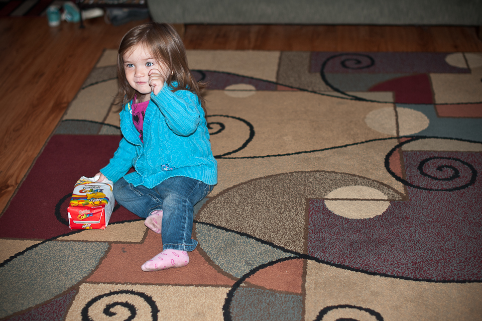 While the coffee table was moved to vacuum, she took advantage of by bringing her goldfish crackers and dancing in the open space. Music was playing on the tv and she took the initiative all on her own. She loves to dance all over the place actually, normally when she's eating though, she's usually happiest then. Just like her daddy. Her and Alyx dancing together is the funniest/cutest/most adorable thing ever!